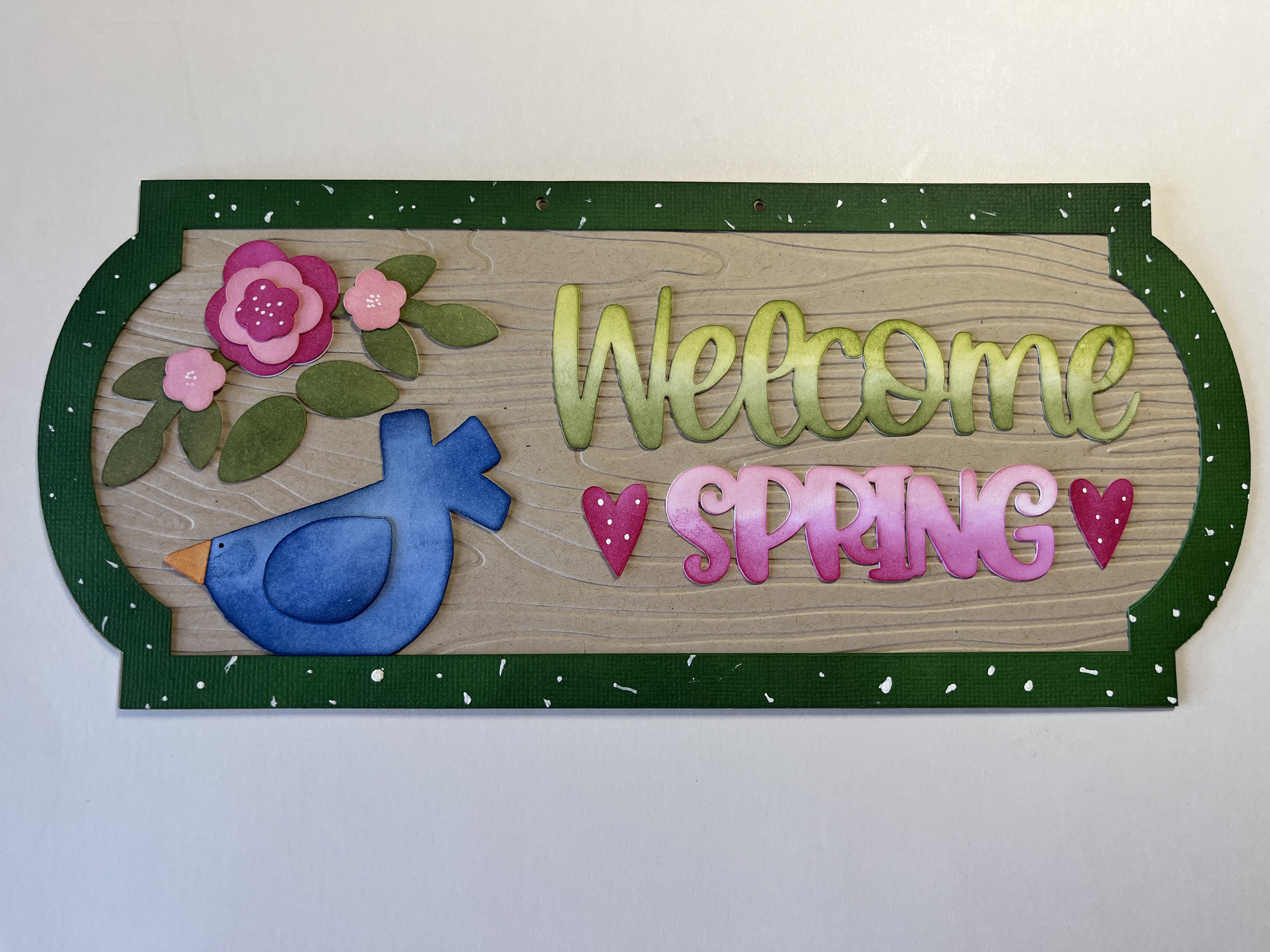 There are 2 or 3 layers for each cut to add stability since this sign is designed as a hanger. The top layer for the kraft colored base is embossed using a Craftwell 8.5×11 embossing folder. Sadly, Craftwell has closed shop and the folder is no longer available.