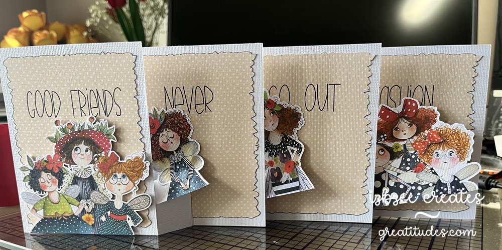 The fairy images are from Etsy and the panel image is from Creative Fabrica (one of their many polka dot collections). The opacity is at 33% with a bold dark blue outline which I did want to show a bit when cut. The Deckle edge rectangle is an oldie from Penny Duncan Crafts (2011). The font for the sentiment (Good Friends Never Go Out of Fashion) is Fairy Sketch. No inking on this version of the card.